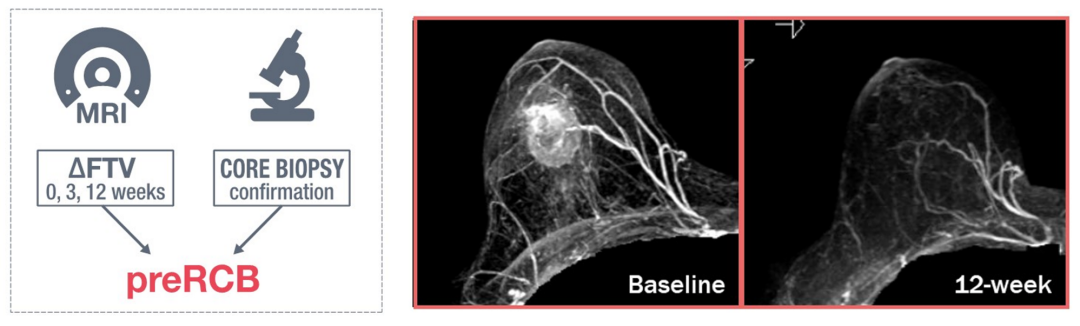I-SPY 2.2新辅助治疗可否手术的“考核标准”,则是基于基线、第3周、第12周的核磁共振(MRI)检查和第12周的穿刺活检来确定是否达到preRCB,即预测残存肿瘤负荷(Predicted Residual Cancer Burden)。如果MRI的功能肿瘤体积(FTV)缩小程度达到阈值,且穿刺活检没有浸润性肿瘤,则为达到preRCB。既往的I-SPY 2研究显示,达到preRCB的患者中,术后残留疾病负荷(RCB)0/1级的比例可达96%,而未达到preRCB的患者这一比例仅为48%。由此可见,达到preRCB的患者有较高的可能性获得pCR;因此,I-SPY 2.2研究对这部分preRCB患者允许接受手术治疗。
