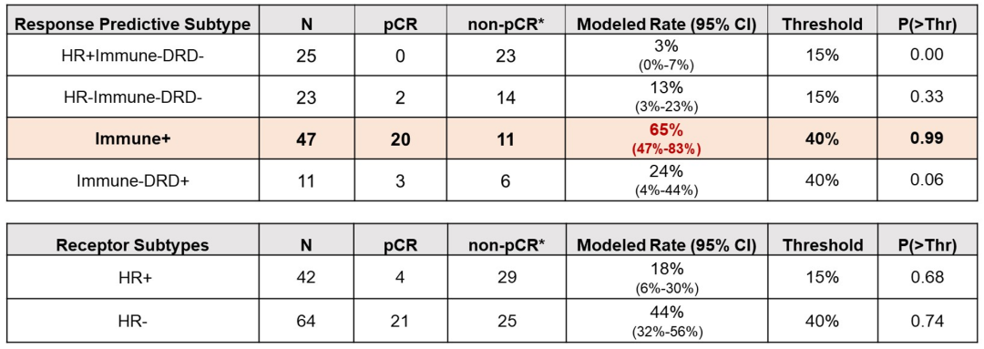 在Dato-DXd+Durva的新辅助治疗中,免疫标志物阳性(Immune+)患者的pCR率达到了43%(20/40),模型pCR率(Modeled Rate)则高达65%,均超过阈值(40%)。此外,TNBC患者的pCR率和模型pCR率也分别达到了33%和44%。