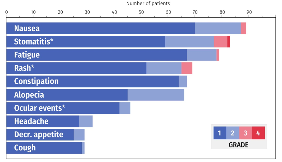 此外,有4例患者发生3级免疫相关皮疹(4例),3级1型糖尿病、自身免疫性肝炎、急性肾损伤各1例,4级结肠炎1例。