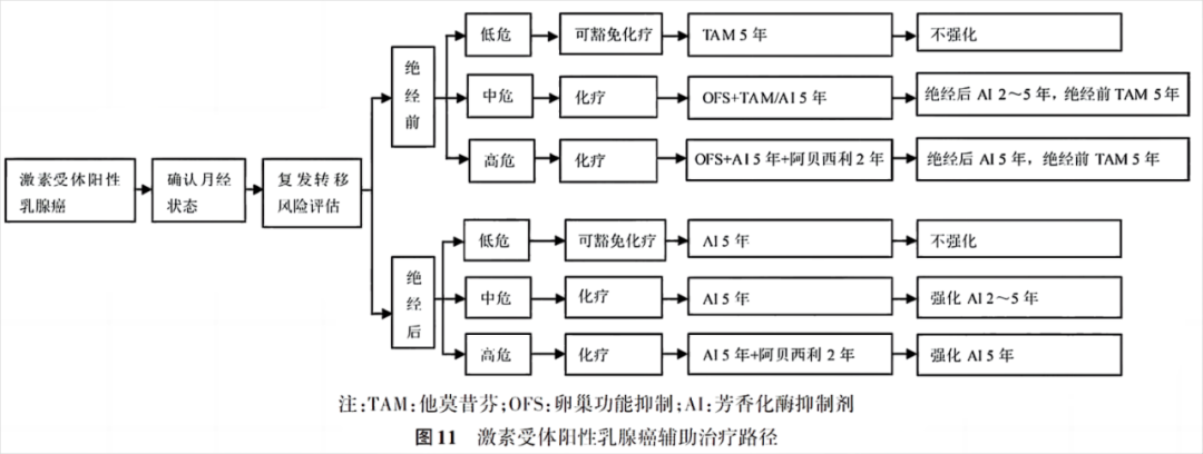 县域(县级或县级市)医院是多数县域乳腺癌患者的首诊单位,国家肿瘤质控中心乳腺癌专家委员会和健康中国研究中心癌症防治专家委员会起草并制定了《中国县域乳腺癌防治管理路径与质量控制指南(2023版)》,旨在进一步促进优质医疗资源扩容下沉、区域均衡布局,提高整体乳腺癌的防控效果,改善县域乳腺癌患者的预后和生活质量。该指南指出,原则上HR阳性的患者皆应接受术后辅助内分泌治疗。指南根据HR+早期乳腺癌患者处于绝经前/绝经后和复发风险予以治疗推荐:①绝经前低危患者豁免化疗,进行TAM治疗5年;高危患者OFS+AI+CDK4/6抑制剂治疗5年,仍处于绝经前则TAM治疗5年,5年若达到绝经后状态则AI治疗5年;中危患者选择OFS+TAM/AI治疗5年,5年后若达到绝经后状态则AI治疗2-5年,仍处于绝经前则TAM治疗5年。②对于绝经后患者,低危患者豁免化疗,AI治疗5年;高危患者AI治疗5年加阿贝西利治疗2年,然后强化AI治疗5年;中危患者选择AI治疗5年,强化AI治疗2-5年。