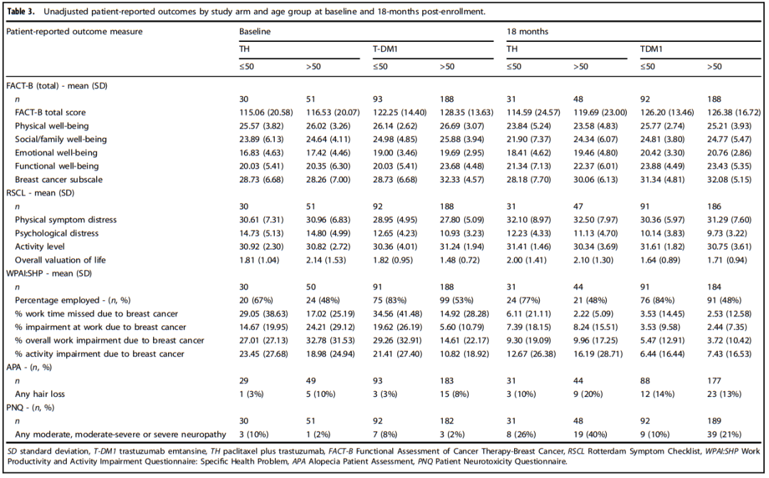 根据脱发患者评估(APA)报告,18个月时脱发状况在年龄组或治疗组间没有显著差异。患者神经毒性问卷(PNQ)显示,在>50的女性中,经过18个月后,残余中度、中度-重度或重度神经病变方面,T-DM1较TH组显著降低(比值比[OR]0.33,95%CI 0.16-0.68),而在≤50的女性中,则有降低的趋势(OR 0.32,95%CI 0.10-1.03)[8]