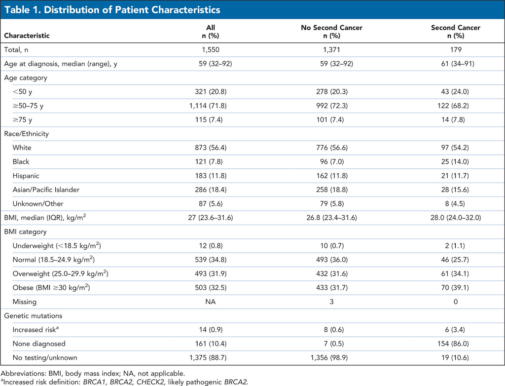 研究共纳入1550名符合条件的患者,初次被诊断为DCIS时的中位年龄为59岁。所有患者至少接受了5年随访,62.1%(n=962)的患者随访时间≥10年;在出现与未出现第二次乳腺癌的患者之间,10年随访时间的患者比例相似(分别为62.6%和62.0%)。在随访期间,11.5%(n=179)的女性出现第二次乳腺癌;其中超重比例更高(出现第二次乳腺癌vs未出现第二次乳腺癌:34.1%vs 31.6%),肥胖比例也更高(39.1%vs 31.7%),而体重正常比则较低(25.7%vs 36.0%)。随访期间有11.3%(n=175)的患者完成了基因检测,其中160例出现第二次乳腺癌,相比之下仅有15例未出现第二次乳腺癌。此外,存在第二次乳腺癌的患者病理性变异较高(3.4%vs 0.6%)。